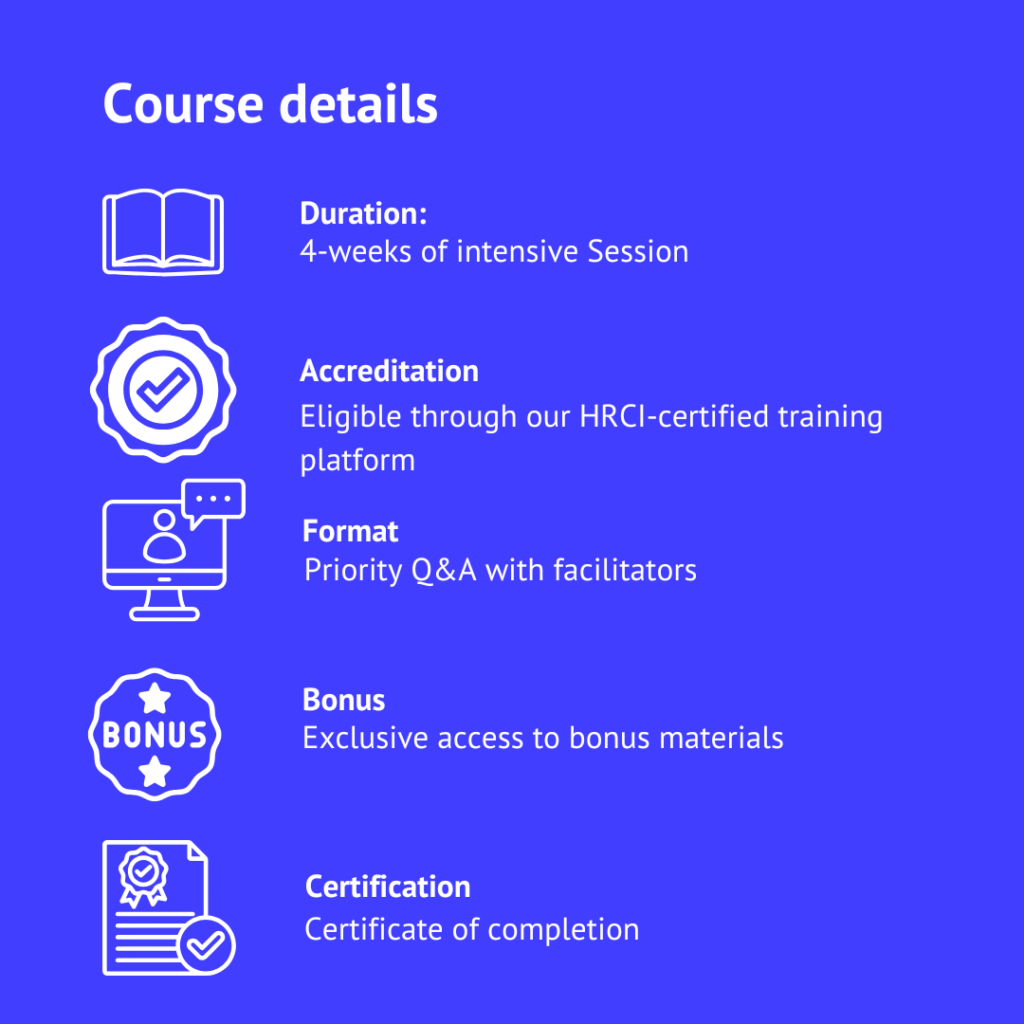 Upon completion, you will receive an official digital badge that can be shared with your professional network on LinkedIn, Twitter, and other social media platforms at the click of a button. Start your journey with us today and stand out in the competitive landscape of HR.